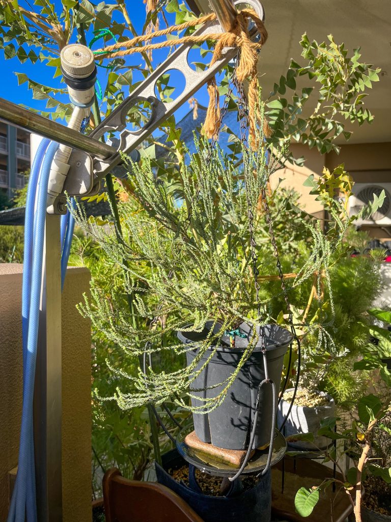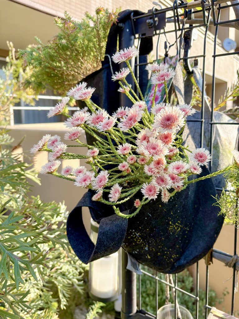 幸いなことにもう一株アクチノジウム シャトルデイジーを育てており、こちらは日当たりの良い屋外フェンスにハンキングさせています。