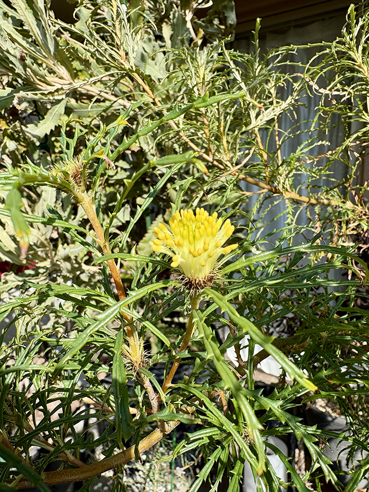 わが家では、バンクシア ポリセファラを日当たりのいい軒下最前列で育てています。