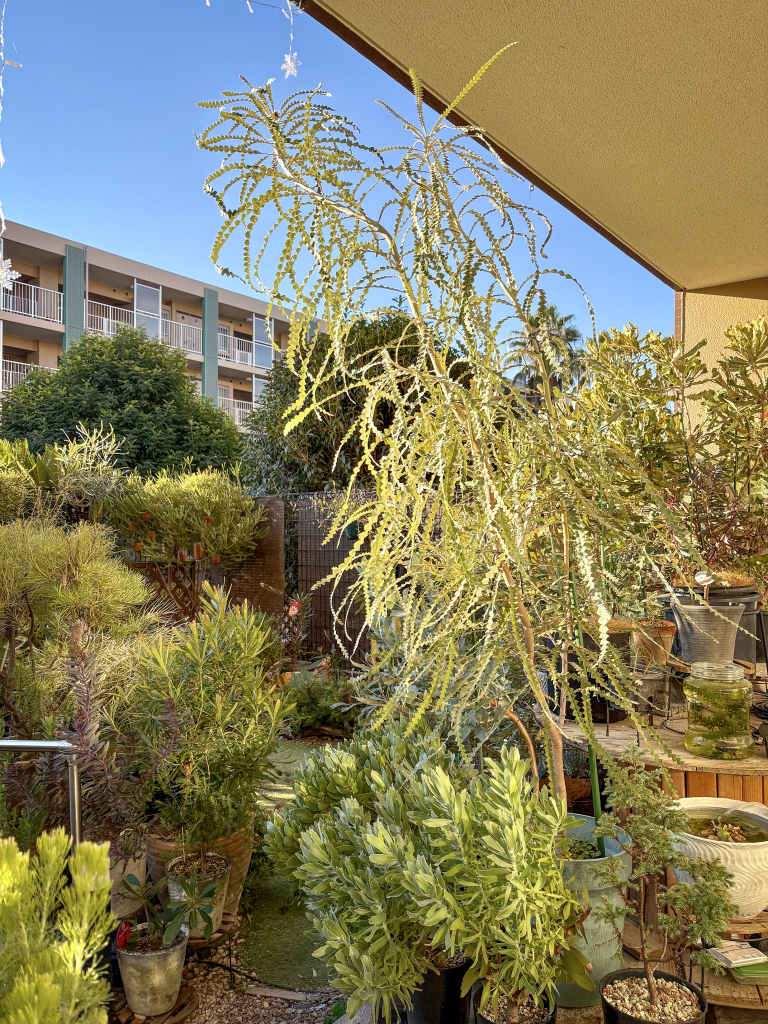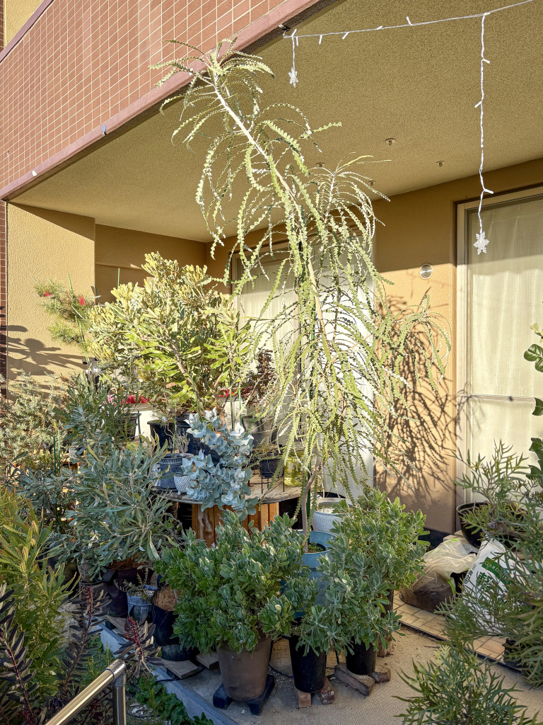 わが家では、バンクシアスペシオーサを軒下で管理して、夏は常にサーキュレーターをフル稼働で回しています。