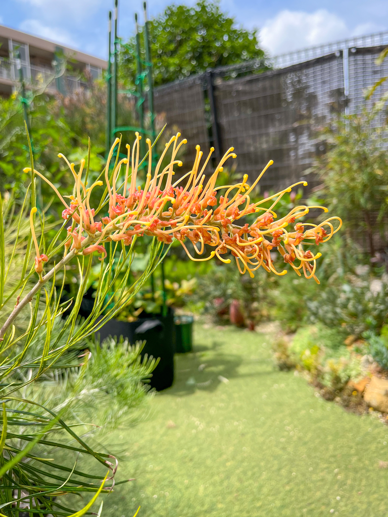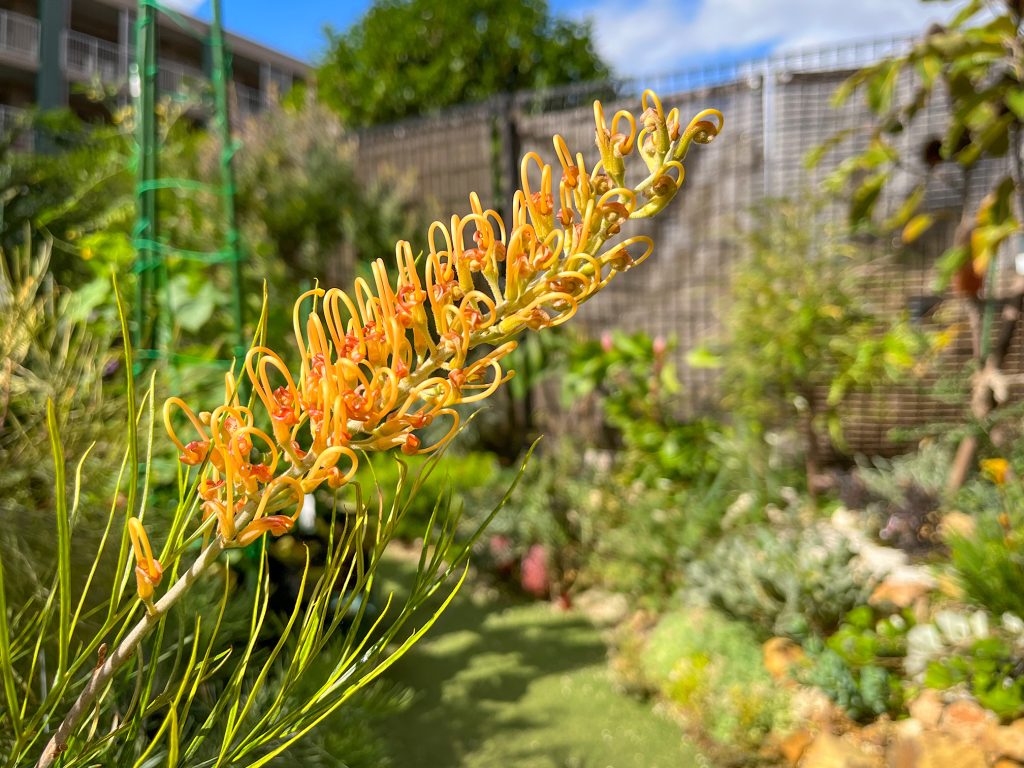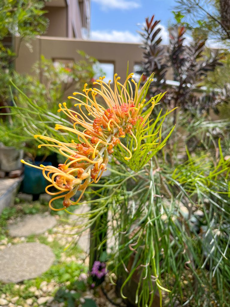 わが家では、グレビレア リトルハニーを1日中日の当たる南向きの屋外スペースで、ハンキングにして育てています。