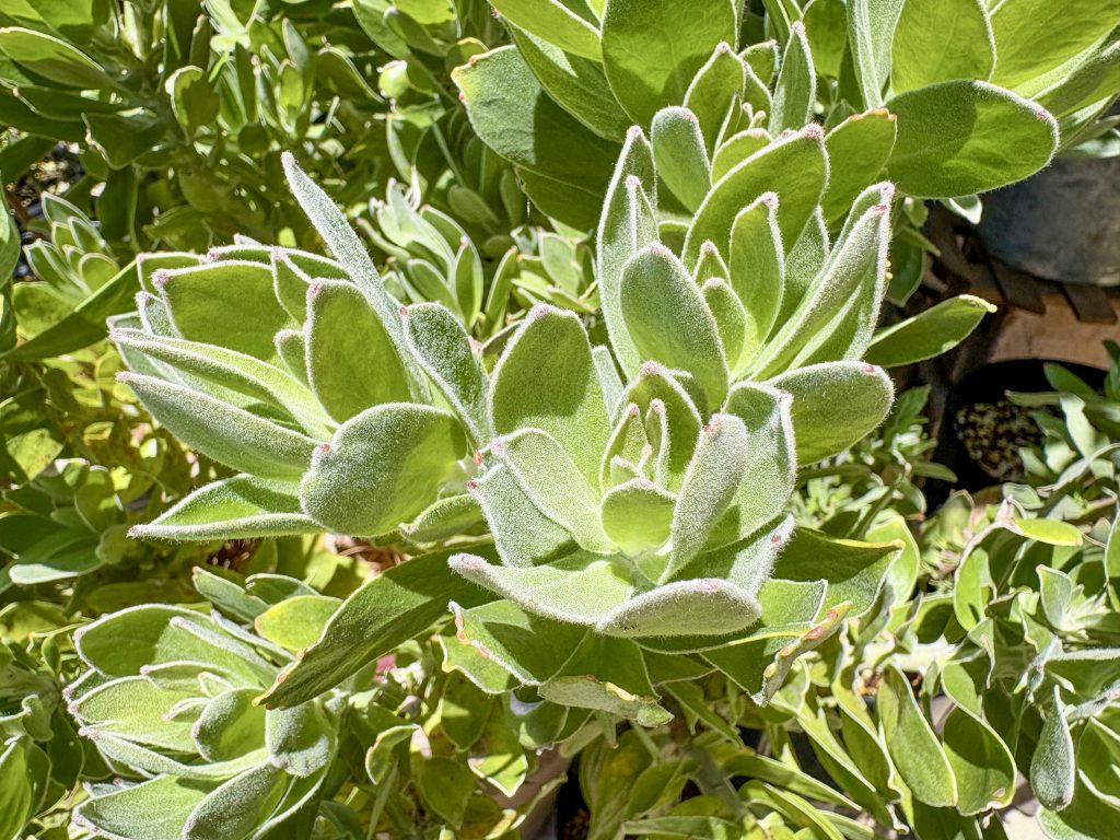 カーニバルコッパー葉はユーカリの王様マクロカルパのような存在感で、太陽の光を反射して光り輝いて見えるシルバーリーフ。産毛に覆われている多肉質の葉は触り心地もふわふわで癒されます。